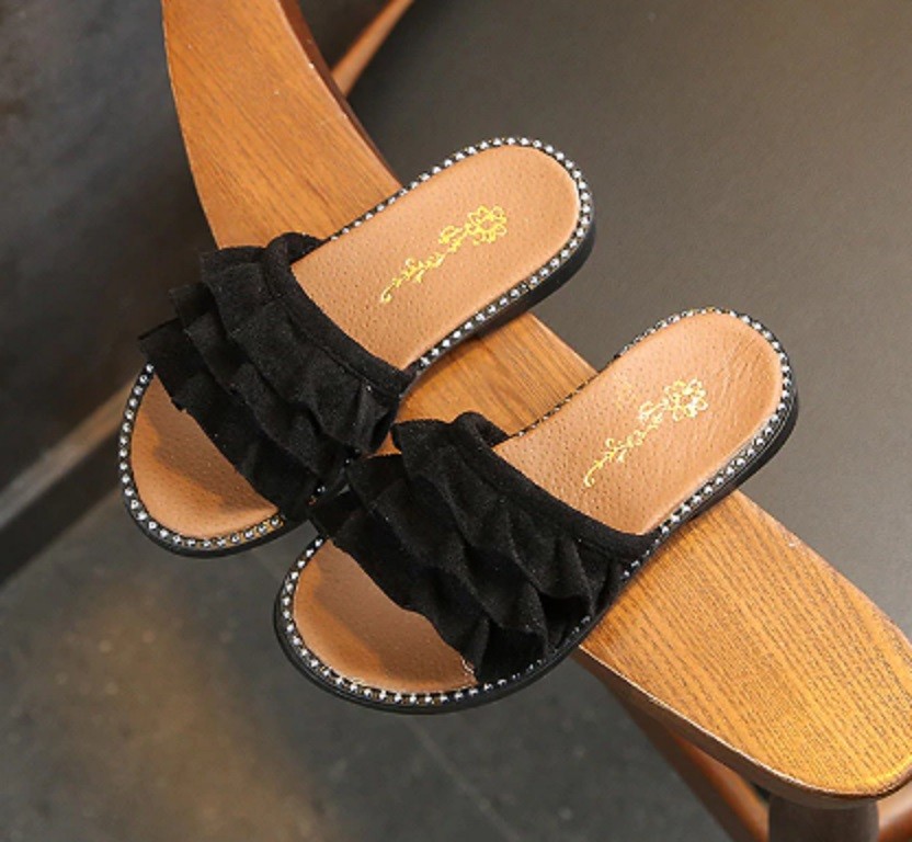 Meisjespantoffels met ruches sieren de voeten van elk meisje.