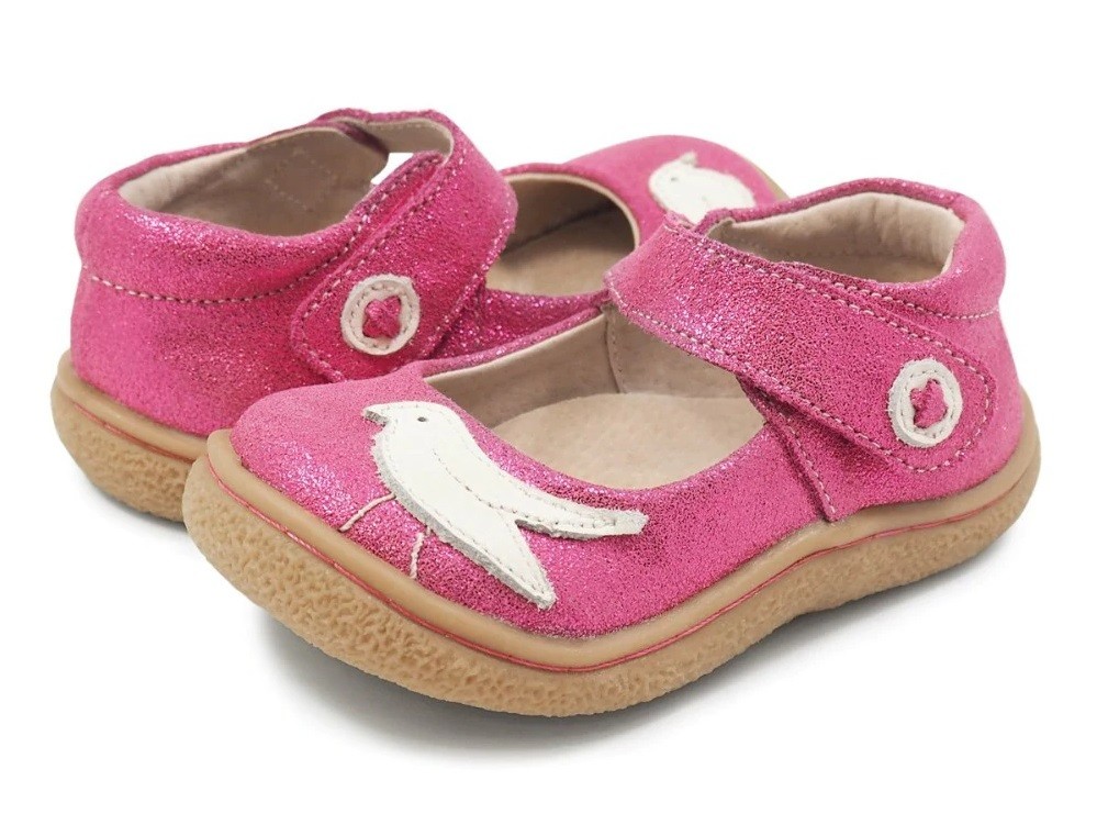 Meisjessandalen met een vogeltje worden door kleine meisjes gedragen met jurkjes, leggings en broeken.