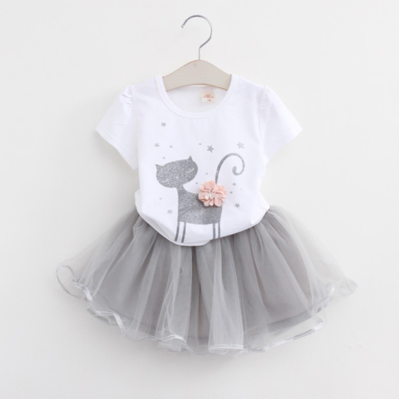 Meisjesset - T-shirt met kat en sterren en rok J1274