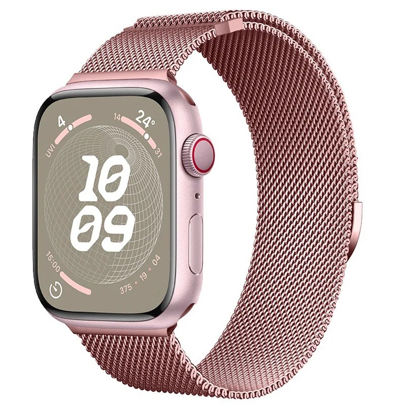 Metalen Milanese band met magnetische sluiting en soepele lengte-regeling. Geschikt voor Apple Watch 42–49 mm, compatibel met series 1–9, SE en SE2, comfortabel en elegant. Volledige beschrijving