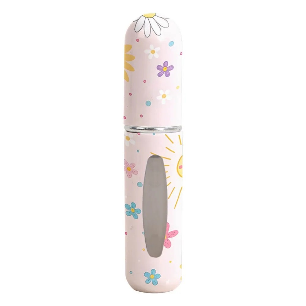 Mini parfumatomizer met doorzichtig venster 5 ml compacte navulbare spray 8.2×1.52 cm lichtroze met bloemenmotief voor onderweg