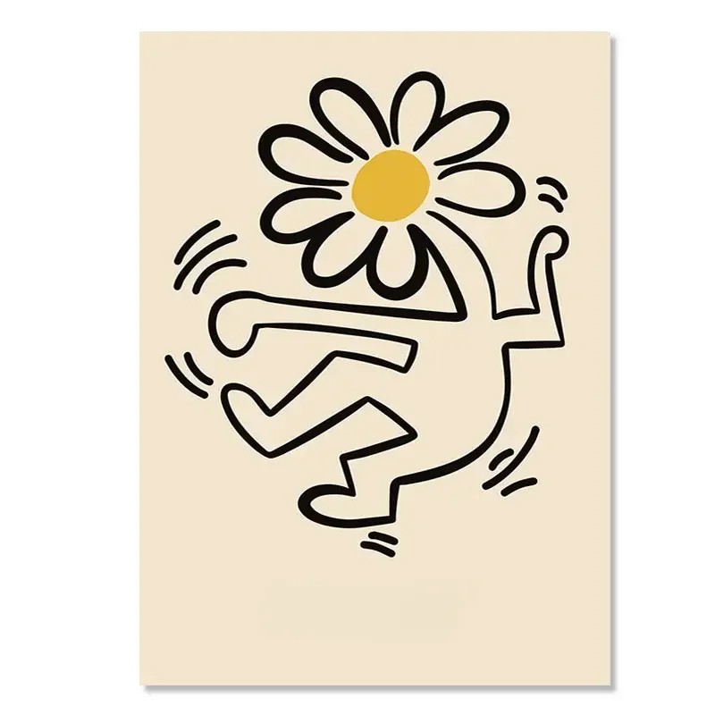 Stijlvolle poster met het motief van een dansende figuur en bloemenhoofd geeft een creatieve sfeer, lichtheid en moderne artistieke expressie aan het interieur. Volledige beschrijving