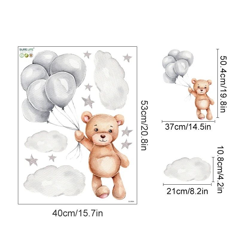 Muurstickers 53 x 40 cm Beer met grijze ballonnen Transparante matte vinyl Zachte decoratie voor de kinderkamer Schattige wanddecoratie