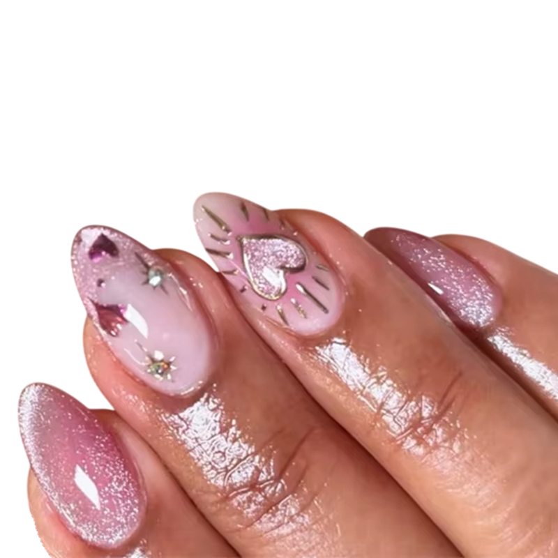 Glinsterende kunstnagels in schattige zoete stijl maken een snelle thuismanicure mogelijk met een verfijnd ontwerp, comfortabel dragen en een elegante uitstraling. Volledige beschrijving