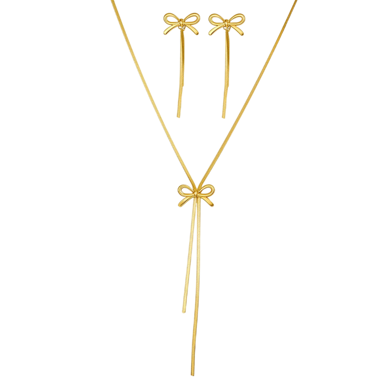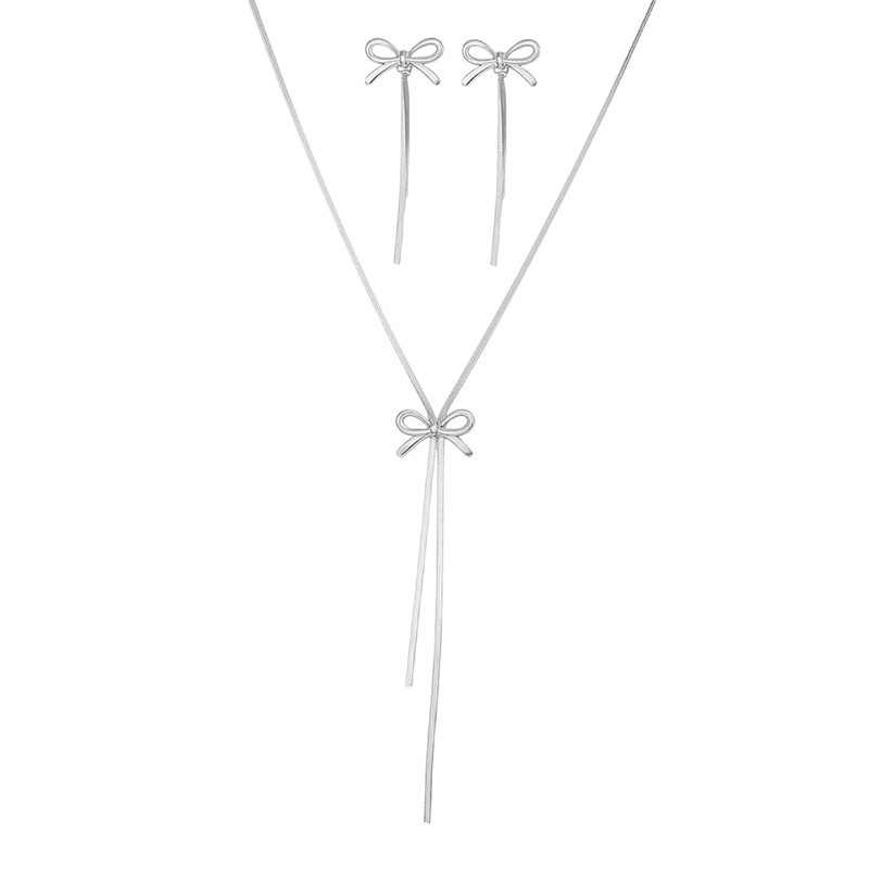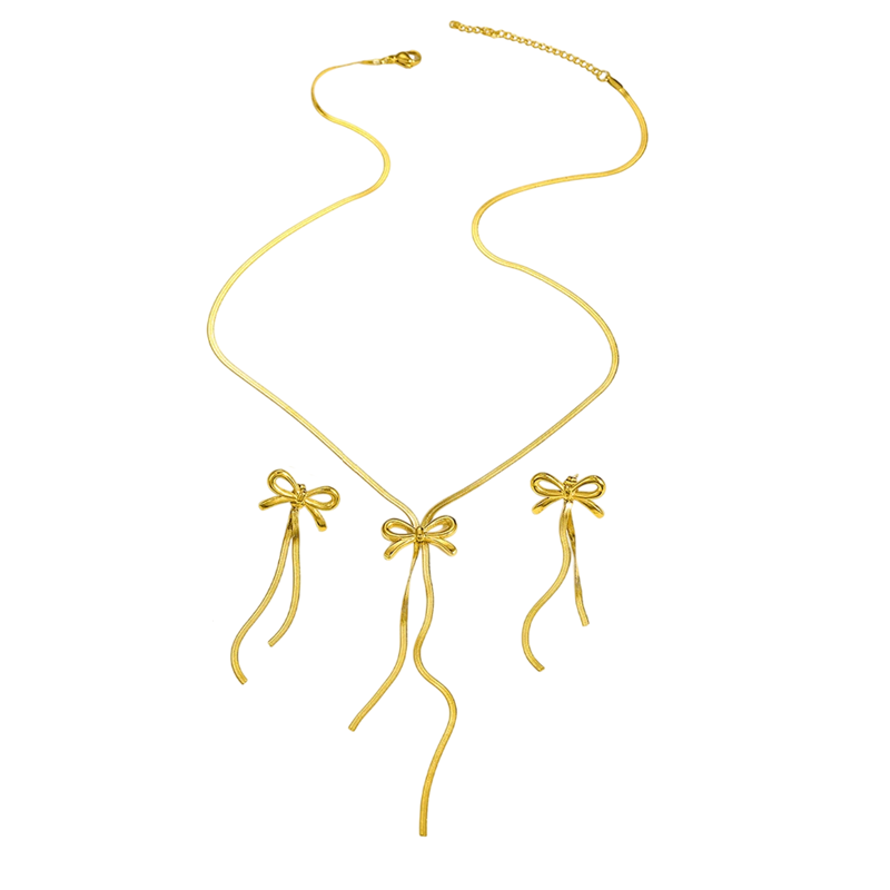 Startpagina Startpagina Sieraden en horloges Dames sieraden en horloges Dameskettingen en -halskettingen Strikvormige roestvrijstalen ketting 47+5 cm en oorbellen 6.4 cm Franse sfeer Fijne strik Dames sieradenset