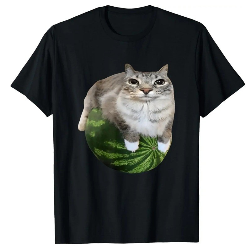 1× T-shirt met een print van een kat die op een watermeloen ligt