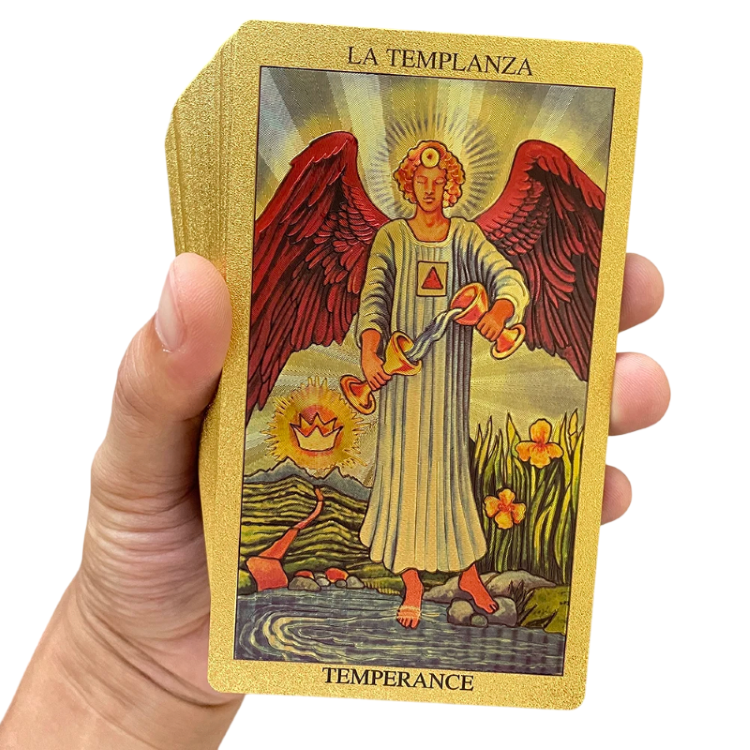 Tarot Gouden Folie met 78 kaarten en een tweetalige gids. Praktisch formaat en duidelijke aanduidingen in het Engels en Spaans. Volledige beschrijving