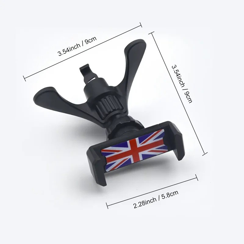 Telefoonhouder 9 × 5,8 cm met het motief van de Britse vlag voor ronde ventilatieroosters. Stabiele bevestiging en eenvoudig in te voegen telefoon met één hand. Volledige beschrijving