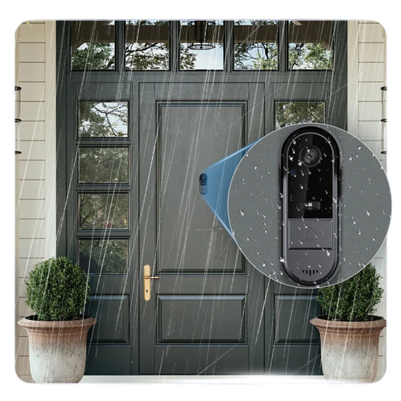 Het ontwerp van de bel is gemaakt voor buitengebruik en voldoet aan de beschermingsgraad IP65, wat betekent dat het bescherming biedt tegen stof en spuitwater. Hierdoor is het apparaat geschikt voor installatie bij voordeuren of poorten, waar het wordt blootgesteld aan normale weersomstandigheden.
