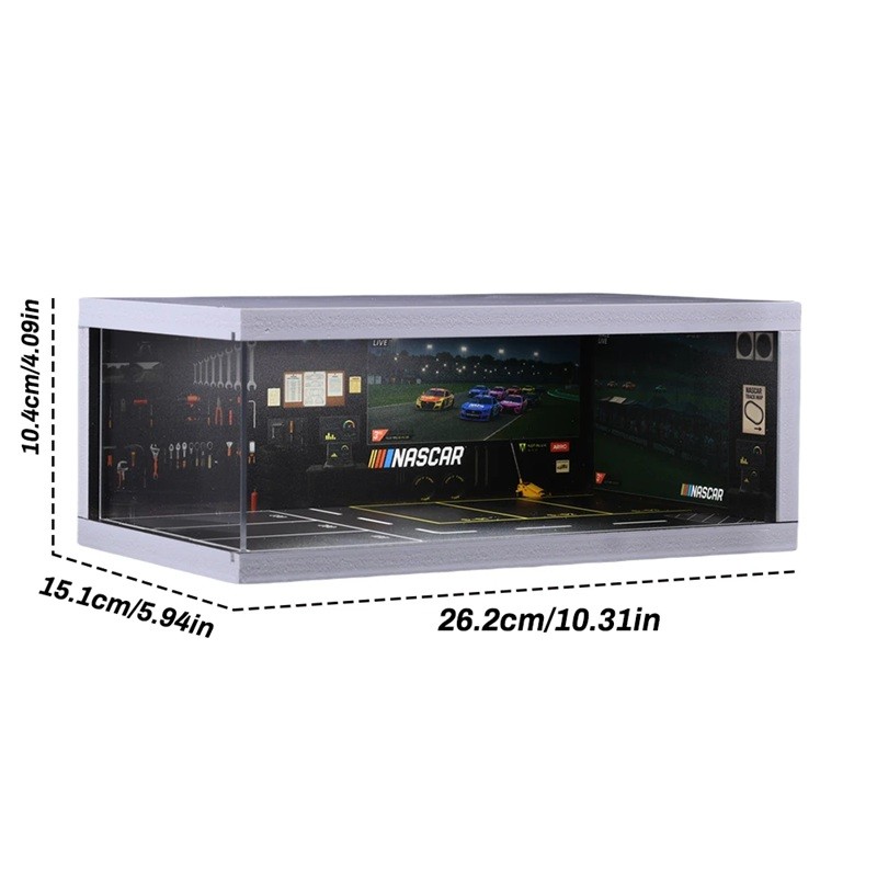 Verlichte garage voor modelauto's 26,2 × 15,1 × 10,4 cm NASCAR Race pitstop service Diorama 1:64 Tentoonstellingsdisplaybox met LED-verlichting
