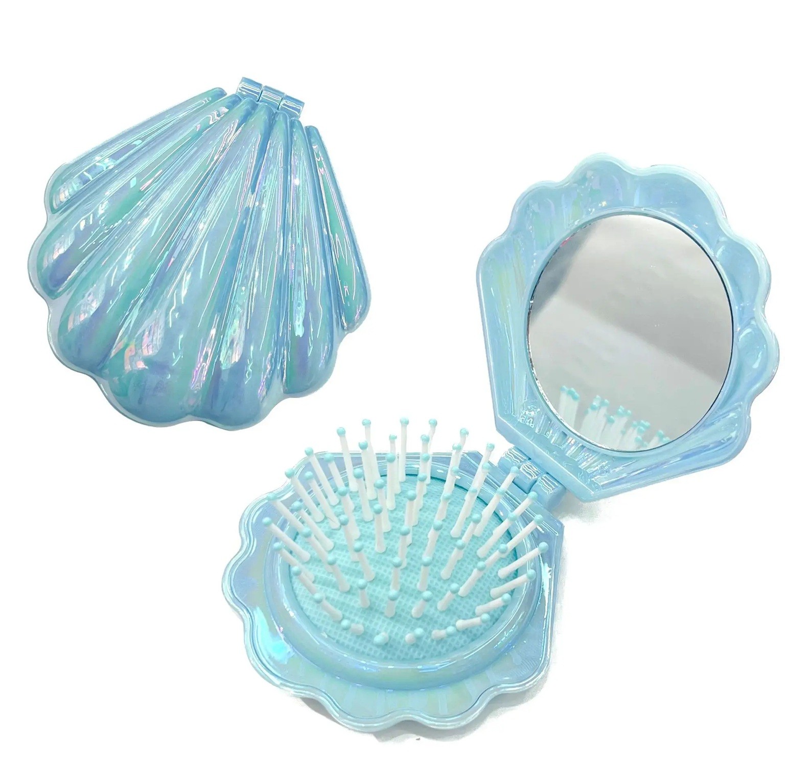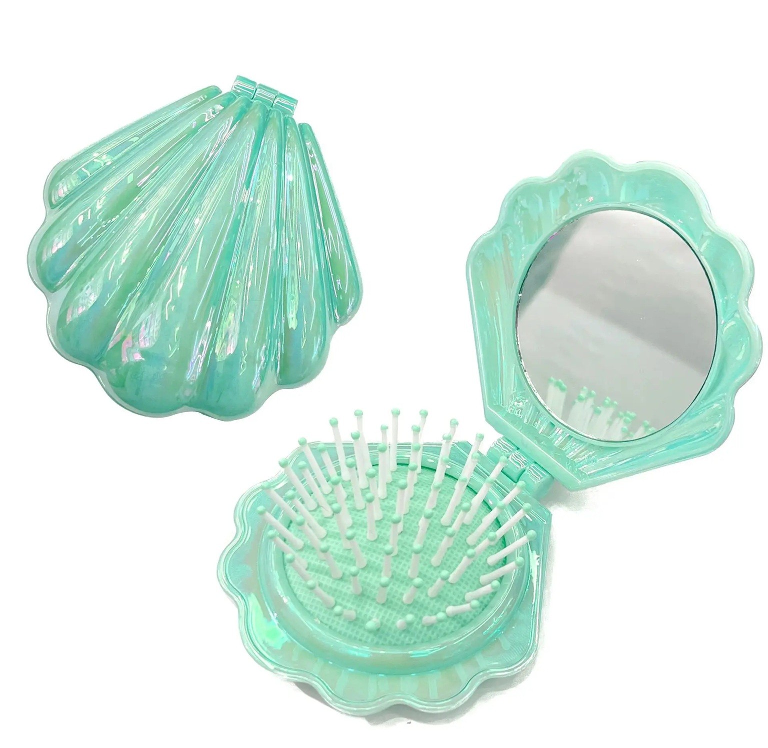 Praktische vouwbare borstel met spiegel in elegant schelpontwerp, ideaal voor in de handtas en op reis voor een snelle haarstyling waar je ook bent. Volledige beschrijving