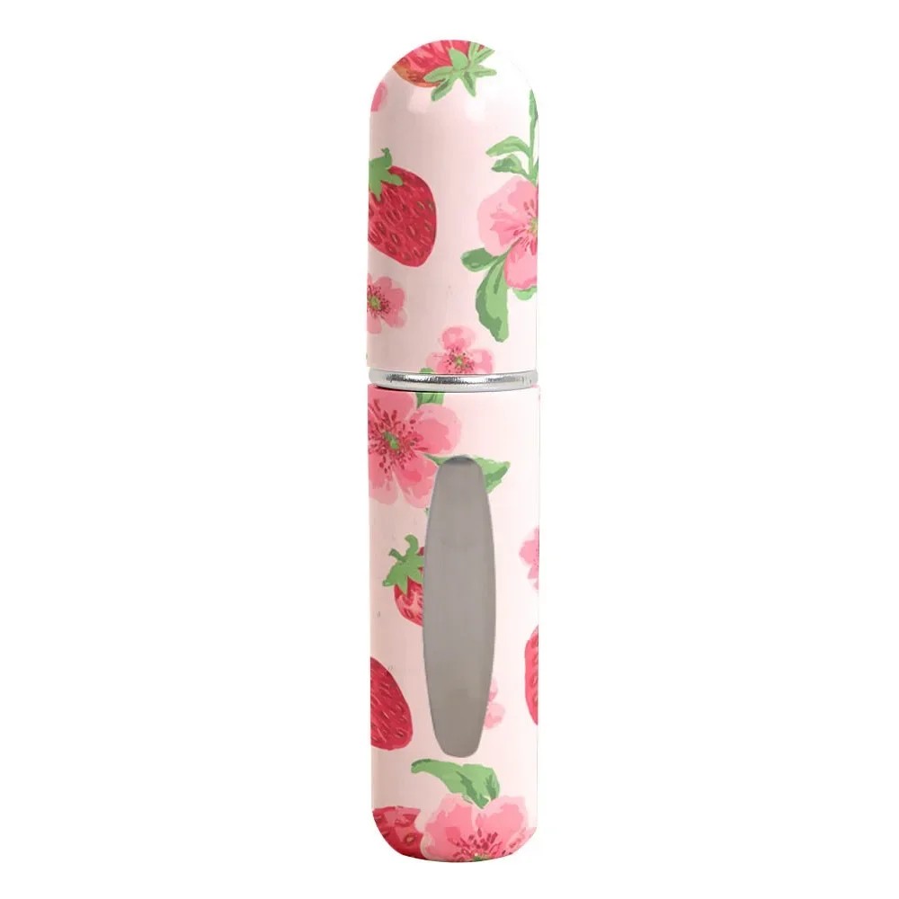 Vulbare mini atomizer voor parfum met doorzichtig venster 5 ml 8.2×1.52 cm lichtroze met aardbei- en bloemmotief voor in de handtas